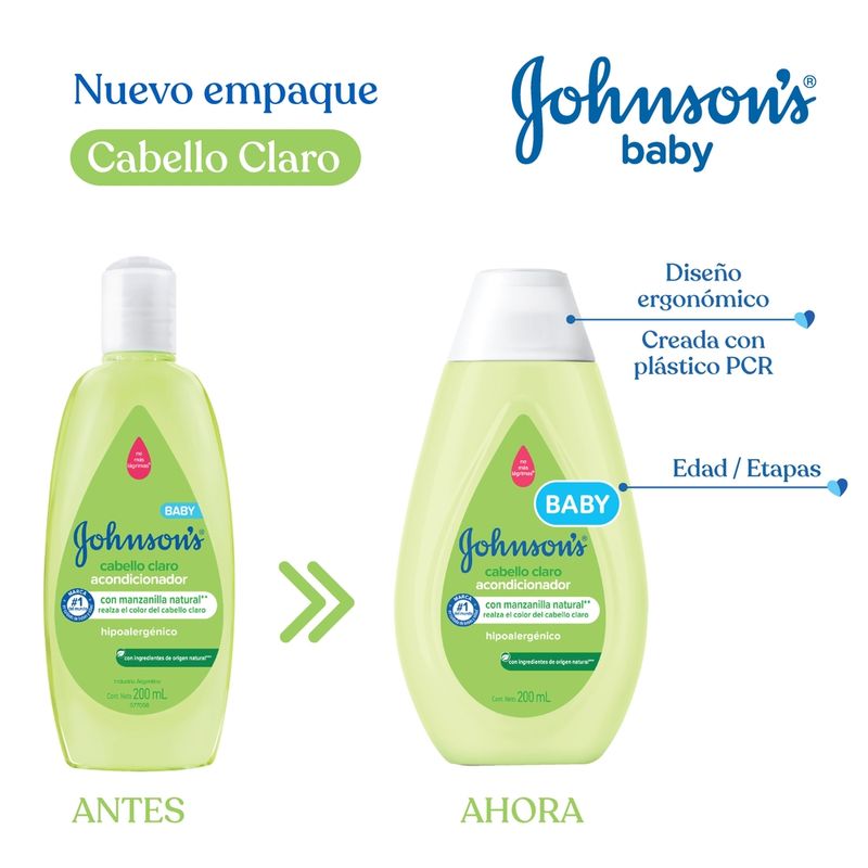 JOHNSON'S Marca #1 del mundo en cuidado de bebes y niños*. Nosotros cuidamos de los bebés desde hace más de 125 años y siempre estamos evolucionando, buscando perfeccionar nuestras fórmulas. Ahora son más suaves para brindar el cuidado que el cabello del bebé necesita. La línea JOHNSON'S Cabello Claro contiene manzanilla natural** que realza el color del cabello de tu bebé. Tiene pH fisiológico, es hipoalergénico y es libre de colorantes, parabenos, sulfatos e ftalatos. Los productos JOHNSON’S son desarrollados para cumplir con los más altos estándares de seguridad de ingredientes.*Euromonitor International limited; Belleza y Cuidado personal, edición 2021, productos de cuidado del bebé y niño, todos los canales de distribución, valor de ventas al consumidor, datos de 2020**fragancia con extracto de manzanilla.