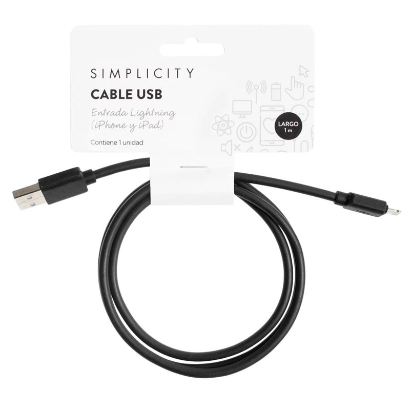 Cable USB Lightning negro de 1 metro de Simplicity, proporciona una conexión fiable para la carga y sincronización de tus dispositivos Apple.