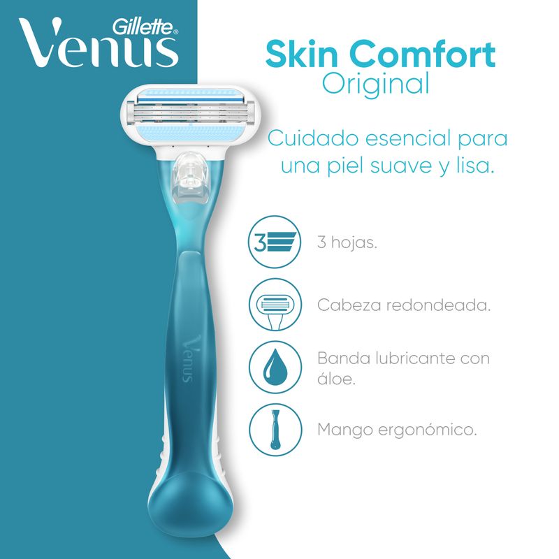 ¿Querés una depilación corporal suave y al ras en solo una pasada? Consigue un cuidado esencial para tu piel con la máquina de afeitar reutilizable Gillette Venus Essential Care Original. El cartucho tiene una cabeza redondeada y 3 hojas rodeadas de suaves almohadillas que protegen la piel al afeitarte. Su banda lubricante con aloe vera facilita el deslizamiento de las hojas de afeitar y te ayudará a conseguir una piel suave y lisa un una sola pasada. El mango de la máquina de afeitar para mujer Venus Original esta diseñado para darte un mayor control al depilarte, incluso mojada, y además funciona con todos los repuestos Venus, excepto con los repuestos Gillette Venus Especial para Área Íntima. Para una mejor experiencia, probá usarla con la Crema de Afeitar Gillette Venus.