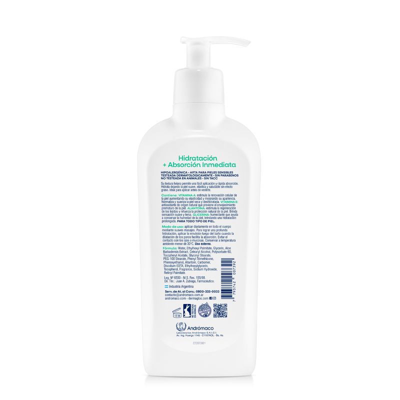 Máxima absorción. Fresca fragancia. Incrementa la elasticidad de la piel. Previene el envejecimiento prematuro. Su innovadora fórmula brinda una hidratación inmediata con máxima absorción logrando una piel lisa y suave, sin efecto graso, gracias a la acción de sus componentes.