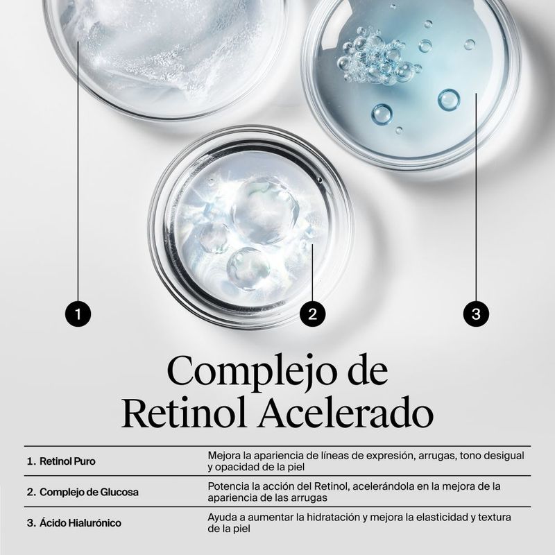 Formulado con 0.1% de retinol puro, un tipo poderoso de vitamina A recomendada por dermatólogos, que ayuda a mejorar la apariencia de las líneas de expresión, la piel opaca, las arrugas y el tono desigual de la piel. Científicamente demostrado que es superior a los ésteres de retinol comúnmente utilizados.