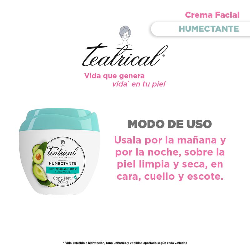 Teatrical crema facial Humectante con células madre y aguacate. Crema de uso diario que brinda elasticidad a los tejidos gracias a sus ingredientes humectantes. Brindando protección contra el foto-envejecimiento y el sistema natural antioxidante.