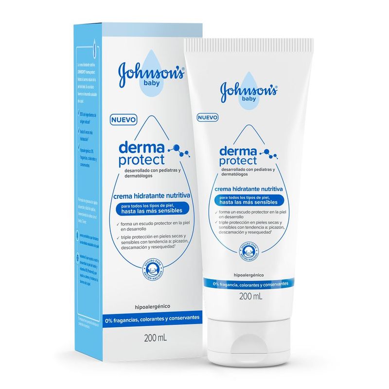 El humectante nutritivo Derma Protect de Johnson's Baby forma un escudo protector sobre la piel en desarrollo con triple cuidado para la irritación, sequedad y alergias. La fórmula no grasa se absorbe rápidamente y es fácil de esparcir, lo que hace más fácil tu rutina con tu bebé. Y cuenta con: avena prebiótica que fortalece la microbiota saludable de la piel; vitamina E que ayuda en la nutrición y desarrollo de la piel del bebé y vitamina B5 (Pantenol), que ayuda a calmar y fortalecer la barrera cutánea.