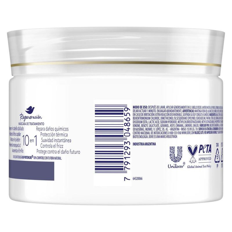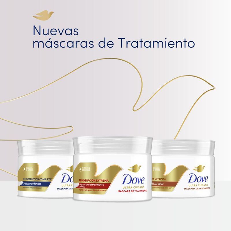 Crema tratamiento 10-1 Dove Óleo Nutrición Nueva máscara de tratamiento 10-1 Dove Nutrición + Fusión de óleos con exclusiva tecnología Bio-Protein Care, 100% compatible con la fibra natural de tu pelo. Tu cabello nutrido, suave y con frizz controlado. Su exclusiva fórmula, con tecnología BIO-NUTRICIÓN con nutrientes y péptidos, trabaja en armonía con la biología natural del cabello para nutrirlo y repararlo en cada uso. Este tratamiento para el pelo tiene la tecnología Bio-Protein Care, actúa sobre las proteínas naturales, tanto en el exterior como en el interior de la fibra capilar. 10 BENEFICIOS: Nutre, Controla el frizz, Sella la fibra, Controla el volumen, Fortalece la fibra, Cabello manejable, Recupera la suavidad, Bloquea la humedad, Brillo inmediato, Previene la resequeda. Descubre la nueva Máscara de Tratamiento Dove Regeneración + Colágeno, potenciada con la exclusiva tecnología Bio-Protein Care. Diseñada para ser totalmente compatible con la fibra natural de tu cabello, este producto está formulado para regenerar incluso el daño más extremo. Este tratamiento para el pelo tiene La innovadora tecnología Bio-Protein Care actúa de manera integral sobre las proteínas naturales del cabello, tanto en su superficie como en su interior. Sus ingredientes activos penetran profundamente para restaurar la sequedad y los daños, devolviendo a tu cabello su vitalidad perdida. Enriquecida con colágeno obtenido mediante biotecnología, un ingrediente reconocido por su capacidad para ayudar en la regeneración de las fibras capilares debilitadas, esta máscara proporciona una solución completa para fortalecer, regenerar y proteger tu cabello.