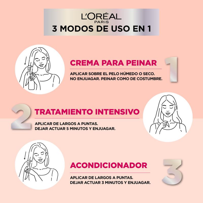 - Crema para peinar: Aplicá sobre el pelo húmedo o seco. No enjuagues y peiná como de costumbre.