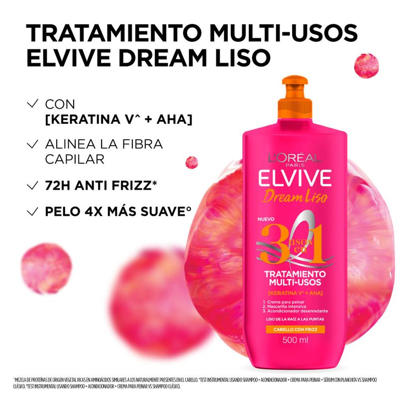 "¿Pelo con frizz? Nuestro Tratamiento Multi-Usos 3 usos en 1 Dream Liso es tu aliado para tener un pelo lacio hasta las puntas. Podes usarlo para: