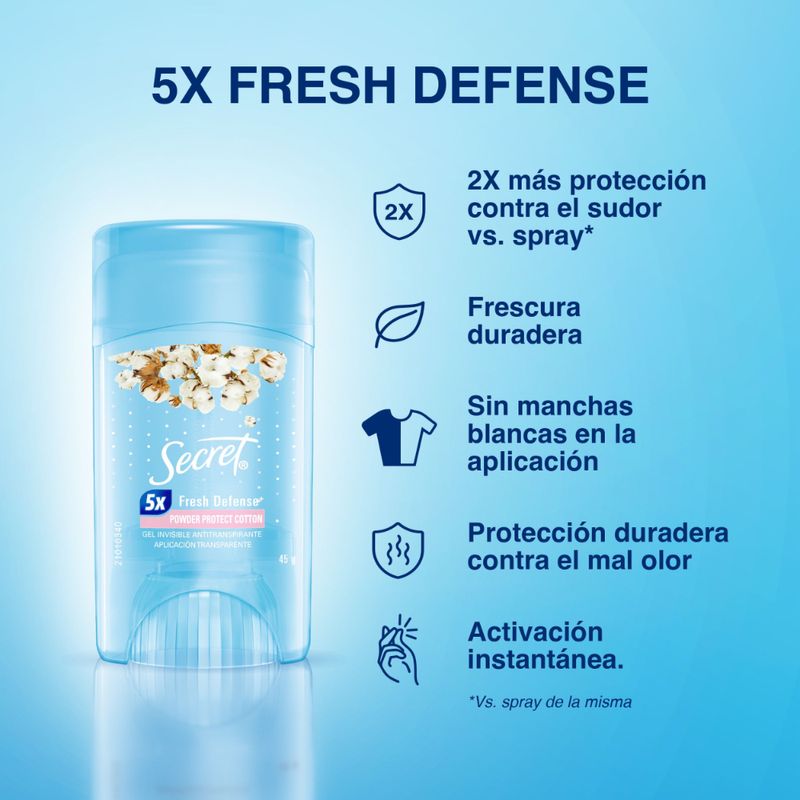 El desodorante antitranspirante en Gel Powder Protect Cotton de Secret tiene un suave aroma como algodón. Con aplicación transparente, te ofrece protección contra el sudor y el mal olor, sin dejar manchas blancas en la aplicación. Siéntete protegida y fresca todo el día.