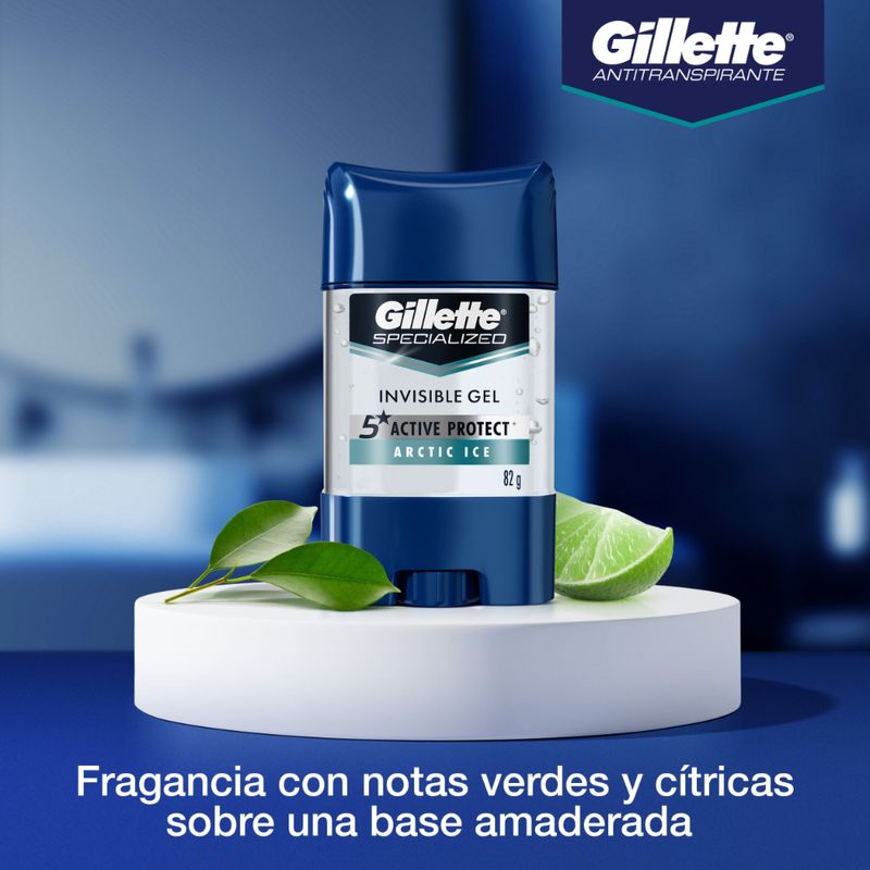 Mantente fresco y protegido con el antitranspirante Gillette Specialized Gel Invisible, que con su sistema 5✯ ACTIVE PROTECT te ofrece protección instantánea contra la sudoración y mal olor sin manchas blancas en la aplicación. Prueba su fragancia de larga duración con notas de madera de cedro, palo de rosa y sándalo, mezclado con notas verdes y cítricas. Su fórmula antibacterial** te mantiene protegido inclusive durante tus entrenamientos más extremos.Además, su aplicación en gel transparente te ofrece 2X más protección contra el sudor vs. spray* desde el minuto cero. Usa Gillette® Antitranspirante, especializado para deportistas.*Vs. Gillette AP Spray**Basado en estudios con bacterias que causan el mal olor corporal: STAPHYLOCOCCUS EPIDERMIDIS, S. HOMINIS & CORYNEBACTERIA MUCIFACIENS, C. TUBERCULOSTEARICUM