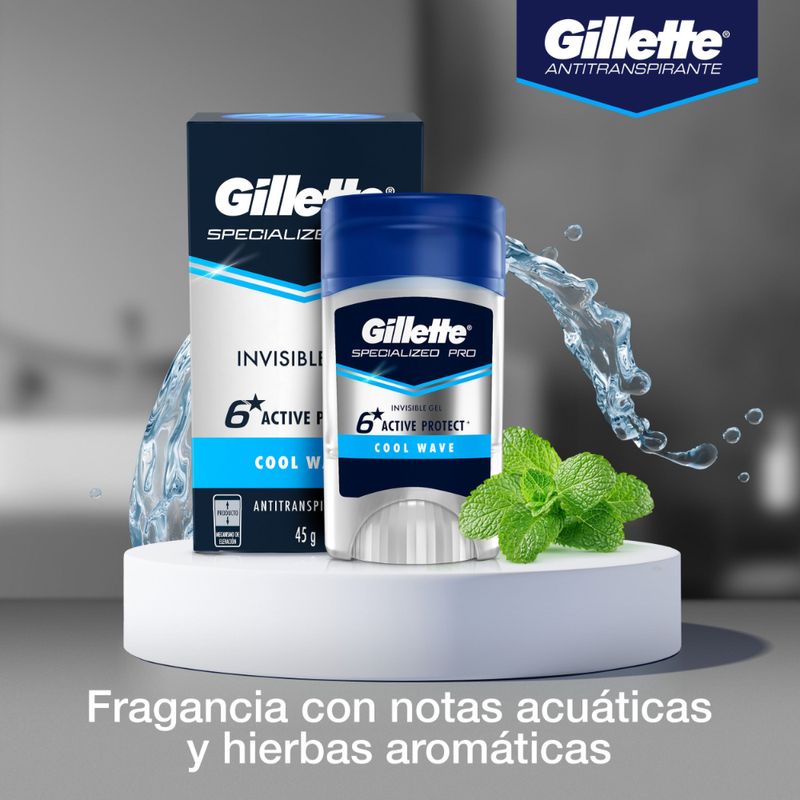 Mantente fresco y protegido con el antitranspirante Gillette Specialized Pro Gel Invisible, que con su sistema 6✯ ACTIVE PROTECT te ofrece protección avanzada contra la sudoración excesiva y mal olor en las axilas, sin manchas blancas en la aplicación.Prueba su fragancia de larga duración con notas cítricas y de melón; en una base almizcle. Su fórmula de antitranspirante antibacterial* te mantiene protegido inclusive durante tus entrenamientos deportivos más extremos. Además, su aplicación en gel invisible te ofrece protección instantánea contra el mal olor y la sudoración. Usa Gillette® Antitranspirante, especializado para deportistas. *Basado en estudios con bacterias que causan el mal olor corporal: STAPHYLOCOCCUS EPIDERMIDIS, S. HOMINIS & CORYNEBACTERIA MUCIFACIENS, C. TUBERCULOSTEARICUM