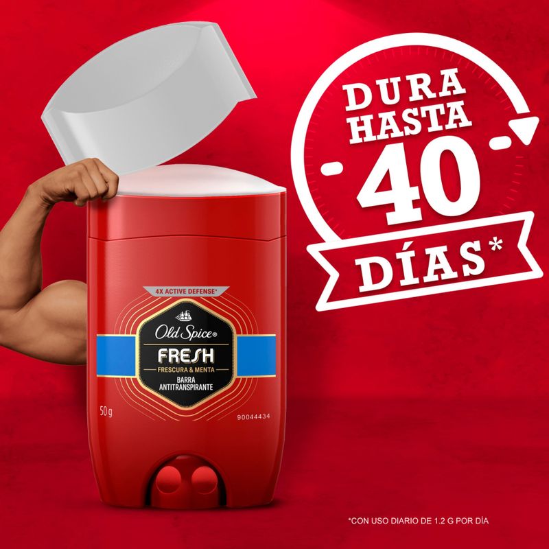 El Antitranspirante para hombre en barra Fresh de Old Spice ofrece protección extrema contra el sudor, manteniéndote increíblemente seco para todo lo que venga y haciéndote oler increíblemente bien, gracias a su poderoso aroma a menta, cítricos y notas herbales. Además, gracias a su tecnología 4X Active Defense+, forma una capa antitranspirante de alta duración que te ofrece protección avanzada contra el sudor y el mal olor hasta por 35 días. +Tecnología 4x Active Defense:2x más protección contra el sudor. Protección poderosa contra el mal olorFrescura duraderaCon acondicionadores de piel Vs Old Spice spray antitranspirante Con uso diario de 1.4 g por día.