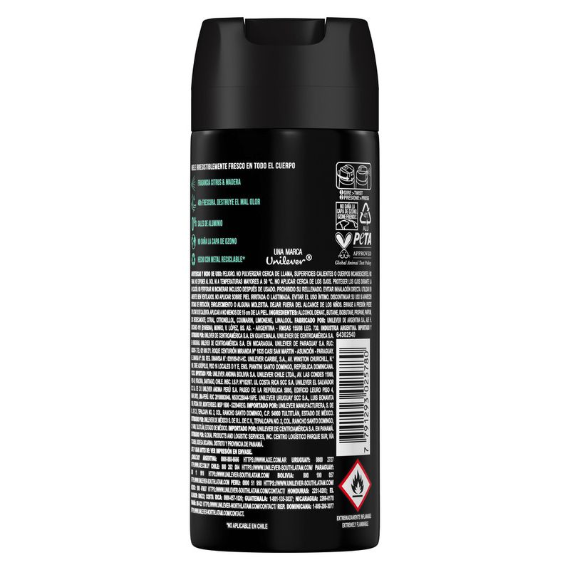 AXE Apollo es un desodorante para hombre corporal que tiene una fragancia con carácter joven. Con notas cítricas y amaderadas, es la fragancia ideal: clásica pero sofisticada. El desodorante AXE Apollo te mantiene 100% fresco y listo para lo que sea que estés haciendo. Su nueva y revolucionaria tecnología de doble acción combate las bacterias que causan el mal olor. Una aplicación rápida del desodorante AXE Apollo te mantiene con un olorcito adictivo e irresistible durante 48 horas. Incluso si estás escalando el monte Olimpo. Agitá, girá la parte de arriba para abrir la tapa del desodorante y rociá el producto por todo el cuerpo. Sentí el poder de los cítricos. Spoiler alert: vas a oler increíblemente adictivo. El mismo aroma del desodorante AXE Apollo en el que siempre confiaste, ahora en lata renovada hecha de aluminio infinitamente reciclable. Más fresco estás vos, más limpio está el planeta. La fórmula de los desodorantes en aerosol AXE tienen 0% sales de aluminio y no dañan la capa de ozono.Modo de uso: