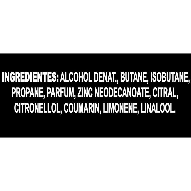 No pulverizar cerca de llama. No exponer al sol ni a temperaturas mayores a 50 °C. Mantener el recipiente herméticamente cerrado en lugar ventilado, fresco y seco. Proteger los ojos durante la aplicación. No perforar ni incinerar. Evitar inhalación directa. No aplicar sobre piel irritada o lastimada. Discontinuar su uso si aparecen síntomas de irritación, enrojecimiento o alguna molestia. Dejar fuera del alcance de los niños. Aplicar solamente en las axilas a no menos de 15 cm de la piel.