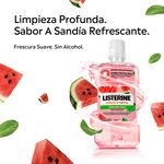 LISTERINE® SANDIA Frescura Suave. Fórmula exclusiva con agentes antibacterianos que eliminan hasta el 99,9% de los gérmenes que causan placa, gingivitis y mal aliento en solo 30 segundos. La innovadora combinación de los cuatro aceites esenciales de LISTERINE® (Timol, Eucalipto, Mentol y Salicilato de Metilo) actúa sobre las bacterias escondidas en lo más profundo de la boca. Comprobado por Odontólogos.