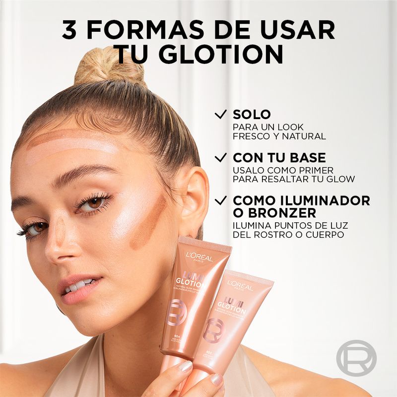 Tres formas de aplicarlo: conseguí un efecto total glow aplicandolo solo, un brillo natural si lo aplicas antes de tu base favorita o glow localizado aplicandolo después de la base como iluminador.