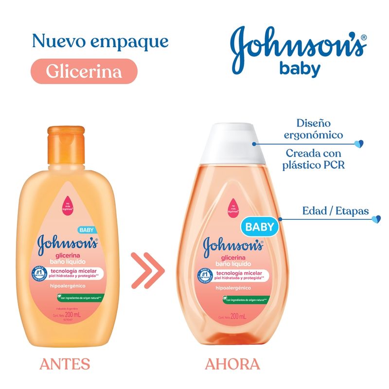 El Baño Líquido JOHNSON'S de Glicerina posee una fórmula tan suave para los ojos, la piel y el cabello del bebé, como el agua pura. Con pH fisiológico, es hipoalergénico y libre de parabenos, sulfatos, colorantes y ftalatos. Su composición ayuda a proteger la barrera natural de la piel, proporcionando así, el cuidado necesario para la hora del baño. Coloque una pequeña cantidad de jabón en las manos. Aplique en la piel del bebé, masajenado con movimientos circulares. Luego enjuague. Este jabón fue desarrollado para minimizar el posible surgimento de alergia y debe ser aplicado por un adulto o bajo la supervisión de uno. No utilizar en caso de que el cuero cabelludo presente irritaciones. Adecuado para su uso diario.