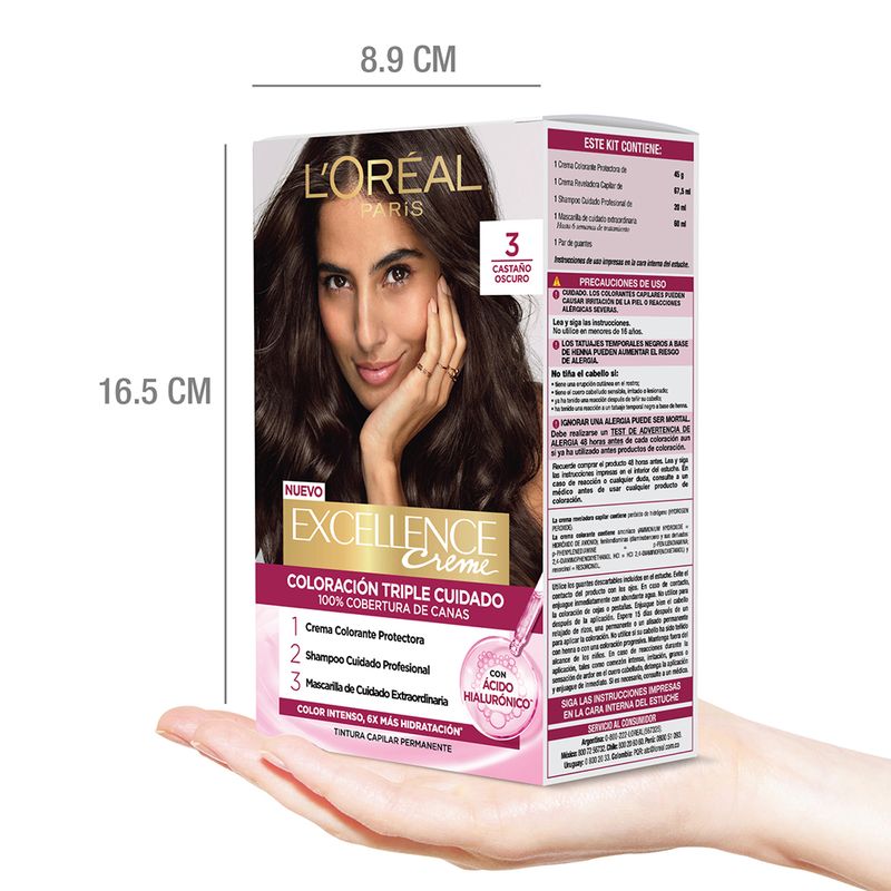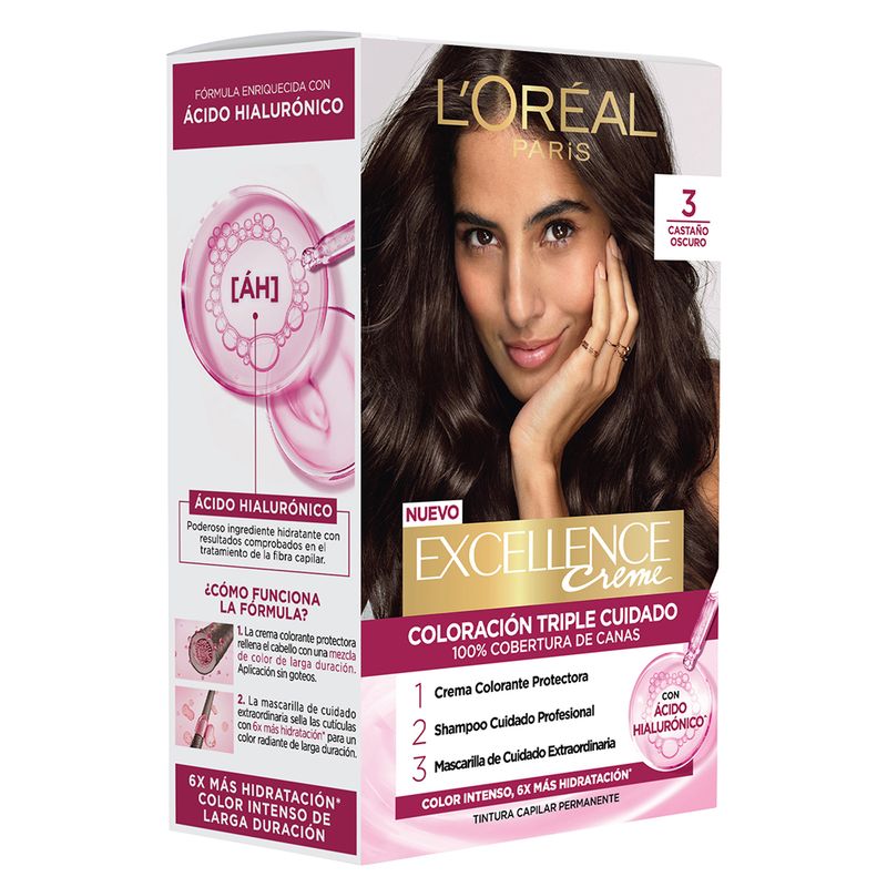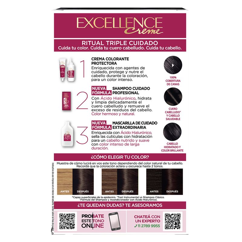 Excellence Creme Coloración Triple Cuidado Enriquecida con Pro-Keratina, protege tu pelo antes, durante y después de la coloración. Cobertura de 100% de canas, para un color perfecto, radiente y duradero.