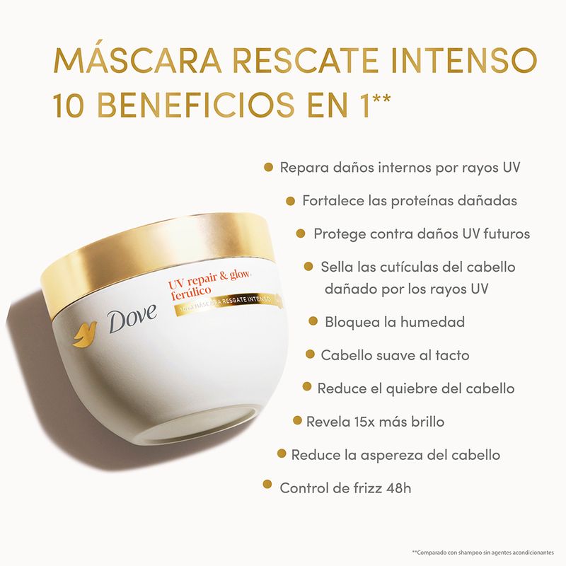 ¿Te preguntas cómo reparar tu cabello extremadamente dañado? Conocé el nuevo tratamiento de rescate capilar Dove Uv Repair. Con su tecnología patentada y 12% de péptido complex, revierte hasta 3 años de daño acumulado. *10 beneficios, con el uso regular del tratamiento de rescate capilar Bond Intense Repair comparado con shampoo sin ingredientes acondicionantes.