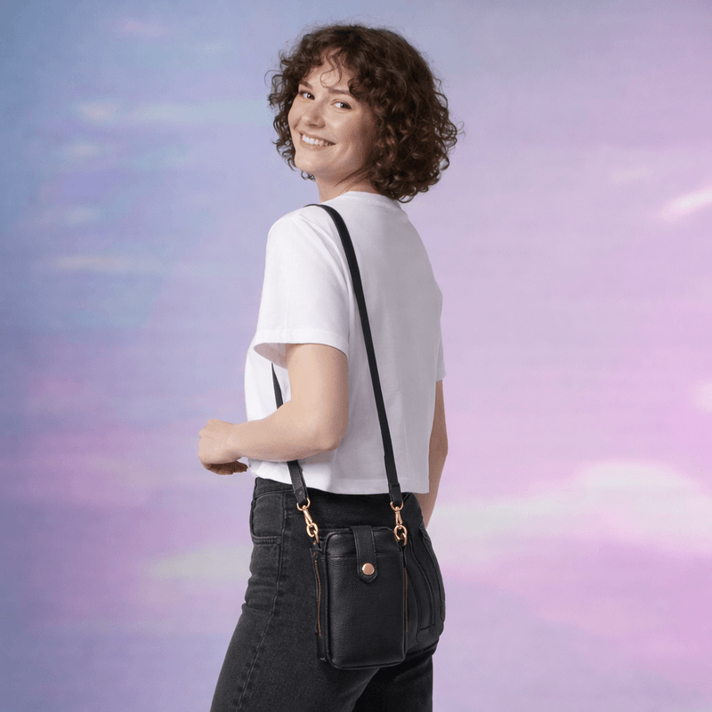 Simplifica lo que llevas contigo sin sacrificar estilo. Este porta celular está diseñado para ser tu aliado más práctico, fusionando el espacio seguro para tu teléfono con una organización dedicada para tus tarjetas. Es ideal para esos días en los que quieres salir ligera, llevando solo lo esencial con elegancia. Sus detalles metálicos y su acabado le dan un toque sofisticado que se adapta a cualquier ocasión, manteniéndote siempre libre de manos.