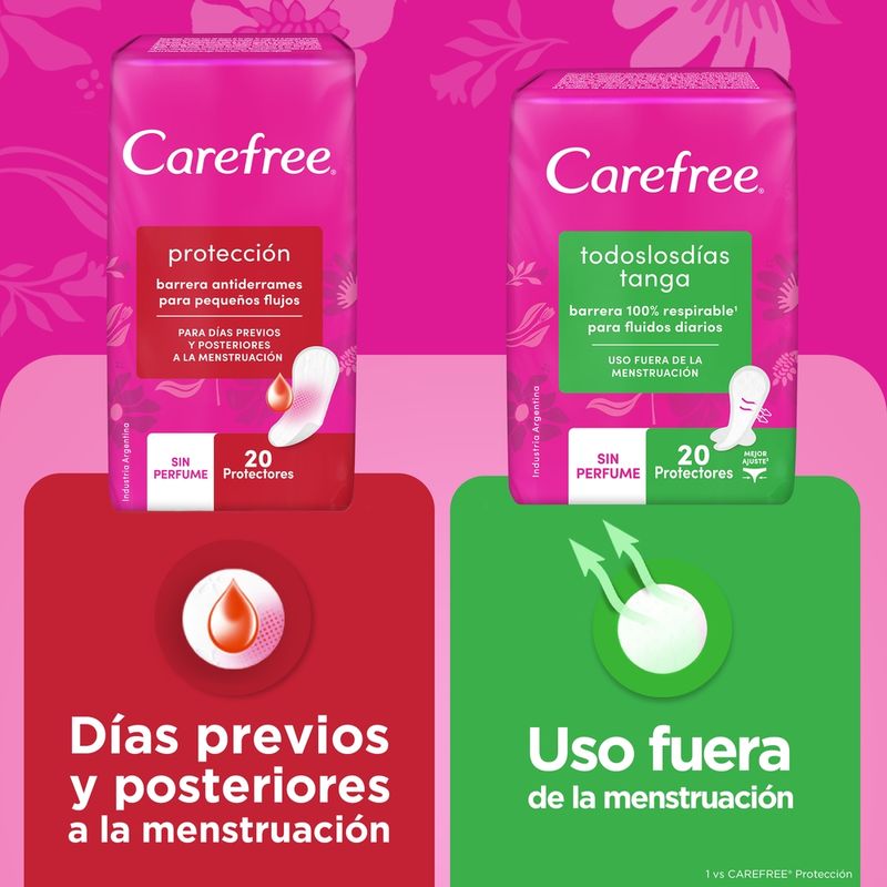Los protectores diarios CAREFREE Todos los Días Tanga son ideales para ser usados durante los 21 días que no estás en tu periodo menstrual. Tienen una exclusiva tela micro porosa que permite que el aire pase 3 veces más* que con un protector diario convencional y así puedas dejar que tu piel respire naturalmente. *comparado con CAREFREE Protección Los protectores CAREFREE Todos los Días Tanga están evaluados ginecológicamente para que puedas usarlos diariamente y te sientas limpia, fresca y súper cómoda con la mayor discreción. El formato tanga tiene mayor ajuste atrás porque tiene unas alitas que se adaptan y adhieren mejor a tu ropa interior. Además, su superficie es delicadamente suave porque está hecho con lo mejor del algodón y no tiene perfume. Contiene neutralizador de olores para que te sientas más segura todo el día, todos los días.