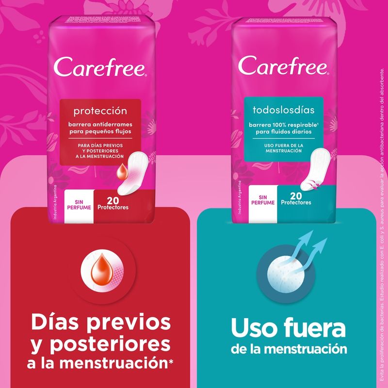 Los protectores diarios CAREFREE Protección son ideales para los días previos y posteriores a tu periodo menstrual ya que tiene una película protectora en la parte de atrás que sirve para retener flujos menores y mantener tu ropa interior siempre limpia. CAREFREE Protección tiene una superficie delicadamente suave porque está hecho con lo mejor del algodón y no tiene perfume. Además, posee neutralizador de olores para que te sientas más segura todo el día, todos los días.