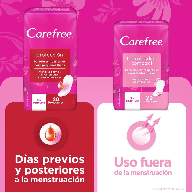 Los protectores diarios CAREFREE Todos los Días Compact son ideales para ser usados durante los 21 días que no estás en tu periodo menstrual. Tienen una exclusiva tela micro porosa que permite que el aire pase 3 veces más* que con un protector diario convencional y así puedas dejar que tu piel respire naturalmente.