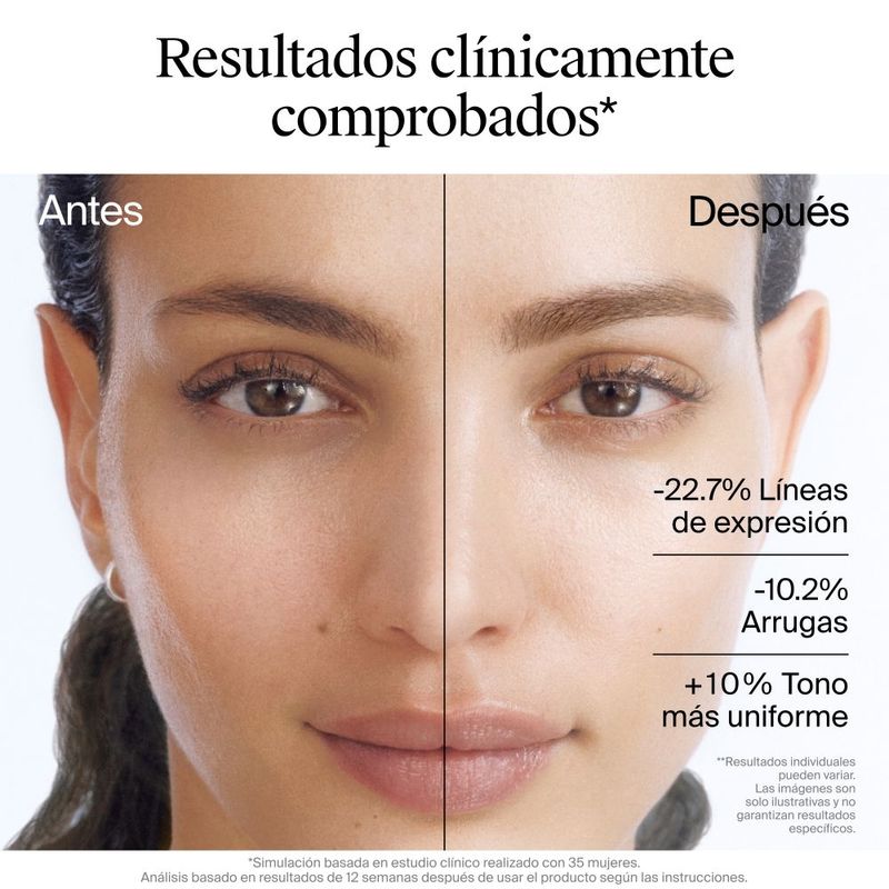 Serum de rápida absorción con retinol, que complementa la renovación celular de la piel para combatir los signos del envejecimiento y proporcionar una piel visiblemente más suave y radiante. Ayuda a reparar visiblemente las líneas de expresión, las arrugas y unifica el tono de la piel a partir de 7 días Formulado con 0.3% de retinol puro, un tipo poderoso de vitamina A recomendada por dermatólogos, que ayuda a mejorar la apariencia de las líneas finas, la piel opaca, las arrugas y el tono desigual de la piel. Científicamente demostrado que es superior a los ésteres de retinol comúnmente utilizados. A su vez, cuenta con complejo calmante que nutre la piel y ayuda a minimizar las causas potenciales de incomodidad para una buena experiencia de uso.