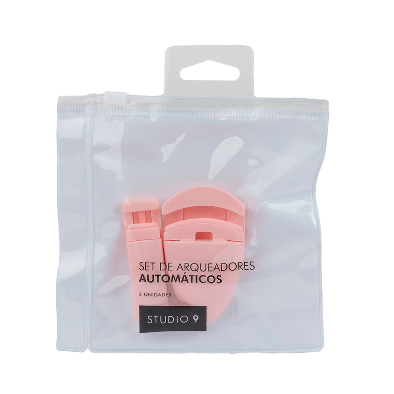 Arqueador de pestañas automático Studio 9, con mango rosa. Diseñado para rizar tus pestañas de manera fácil y efectiva.
