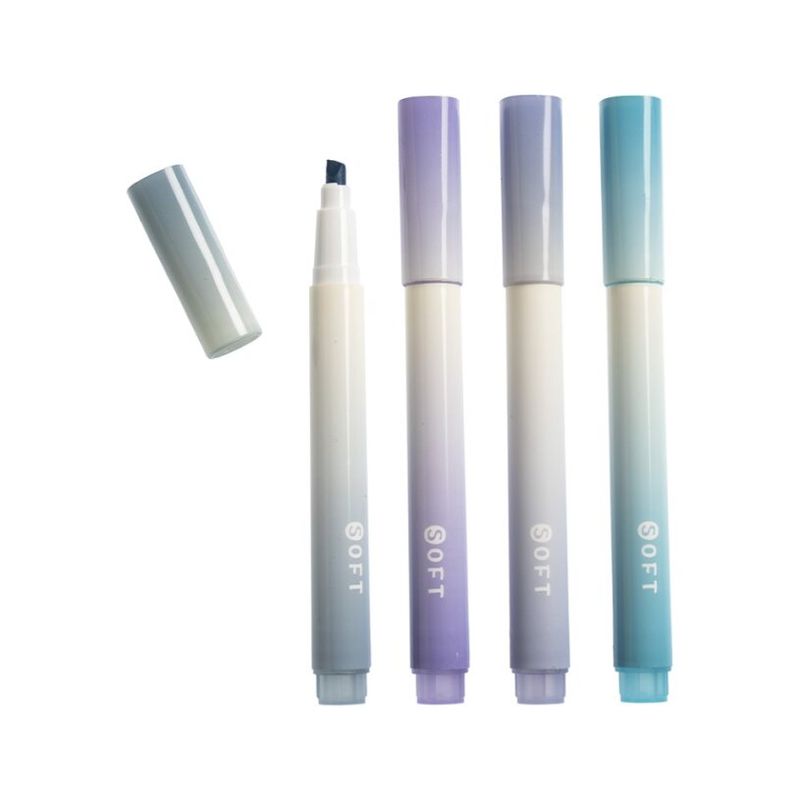 Un set de cuatro resaltadores de plástico con diseño de degradé y color celeste. Tienen punta biselada y tinta fluorescente de diferentes tonos de celeste. Tienen un tamaño de 12 cm y un tapón con clip. Ideales para resaltar, marcar o colorear. Añaden un toque de suavidad y tranquilidad a tus apuntes.
