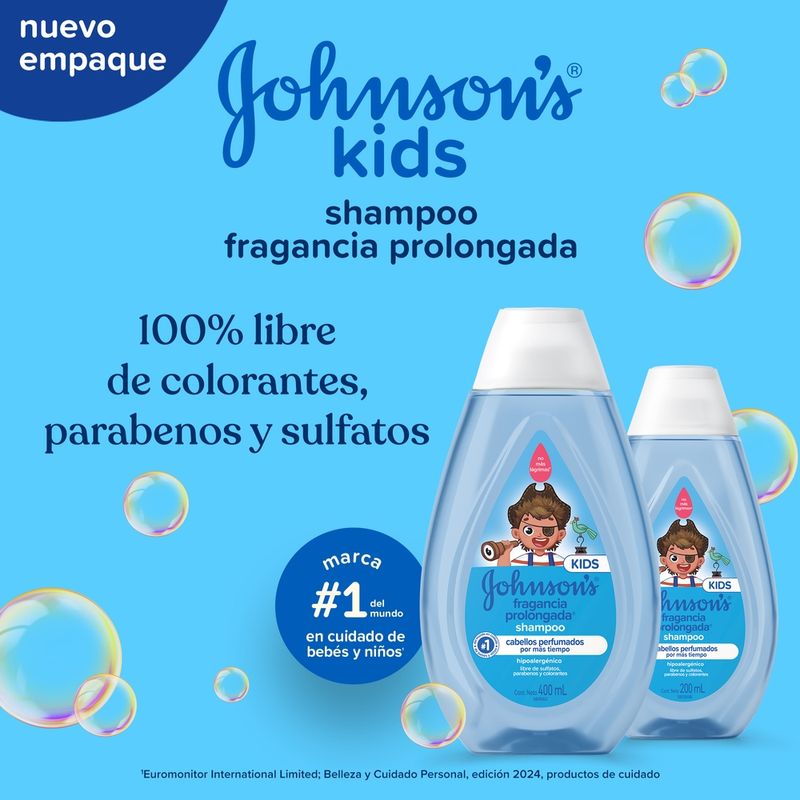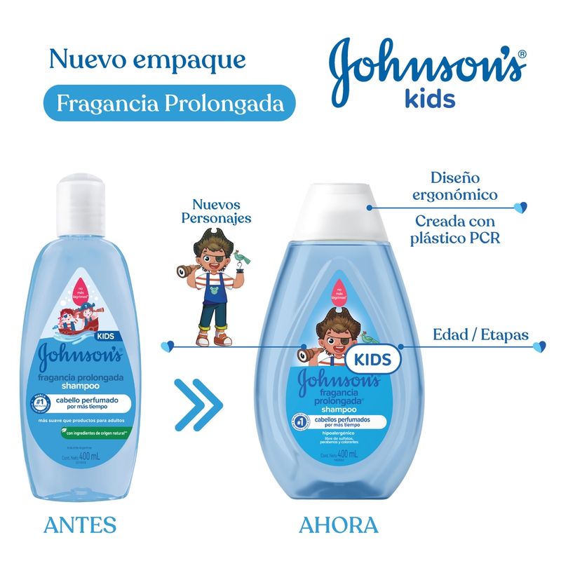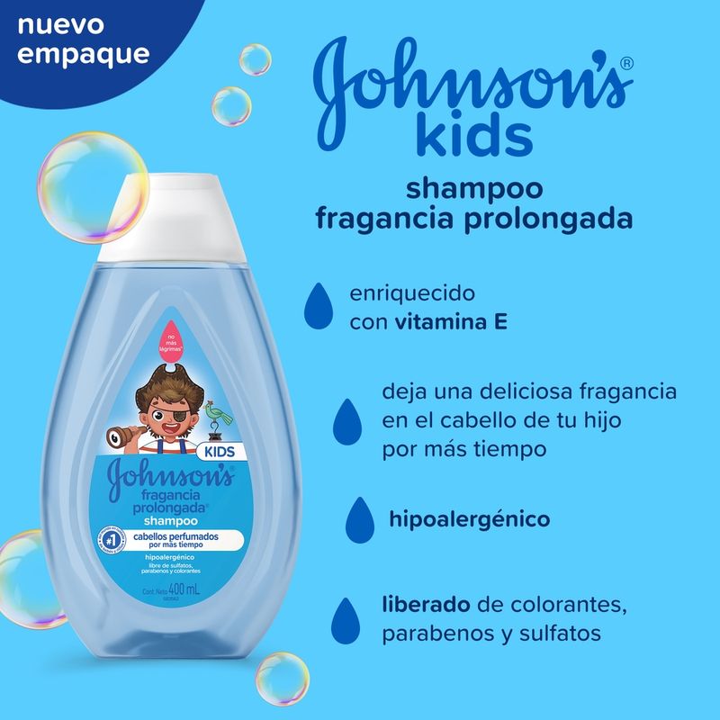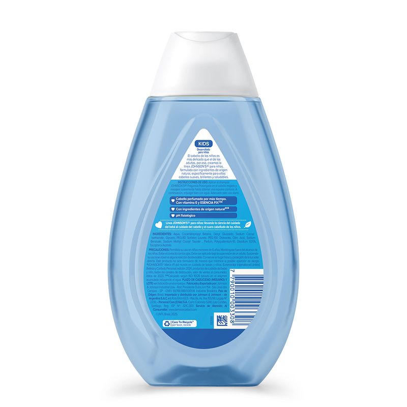 El Shampoo JOHNSON’S Fragancia Prolongada deja el cabello perfumado por más tiempo debido a su composición con vitamina E y tecnología de esencia FIX™. Tiene pH fisiológico, es hipoalergénico y es libre de colorantes, parabenos, sulfatos e ftalatos. Para cabellos aún más perfumados utilice también el acondicionador de la línea. Debe ser aplicado por un adulto o bajo su supervisión. No aplicar en cuero cabelludo que presente irritaciones. Adecuado para uso diario.