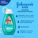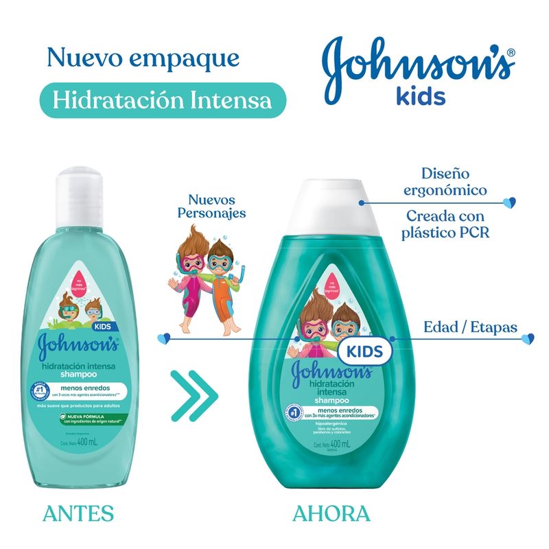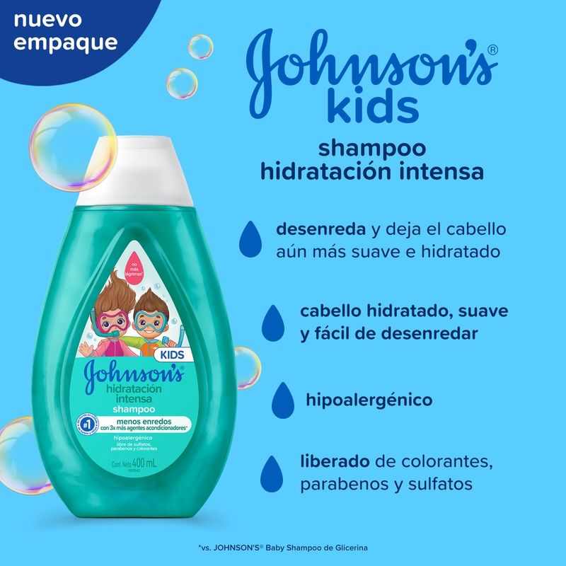 El Shampoo JOHNSONS Hidratación Intensa deja el cabello hidratado y fácil de peinar, gracias a su fórmula con 3 veces más agentes acondicionadores. Cuenta también con pH fisiológico, es hipoalergénico y libre de colorantes, parabenos, sulfatos y ftalatos. Los resultados son todavía mejores cuando se usa junto al shampoo de la misma línea. Debe ser aplicado por un adulto o bajo la supervisión de uno. No utilizar en caso de que el cuero cabelludo presente irritaciones. Adecuado para su uso diario.