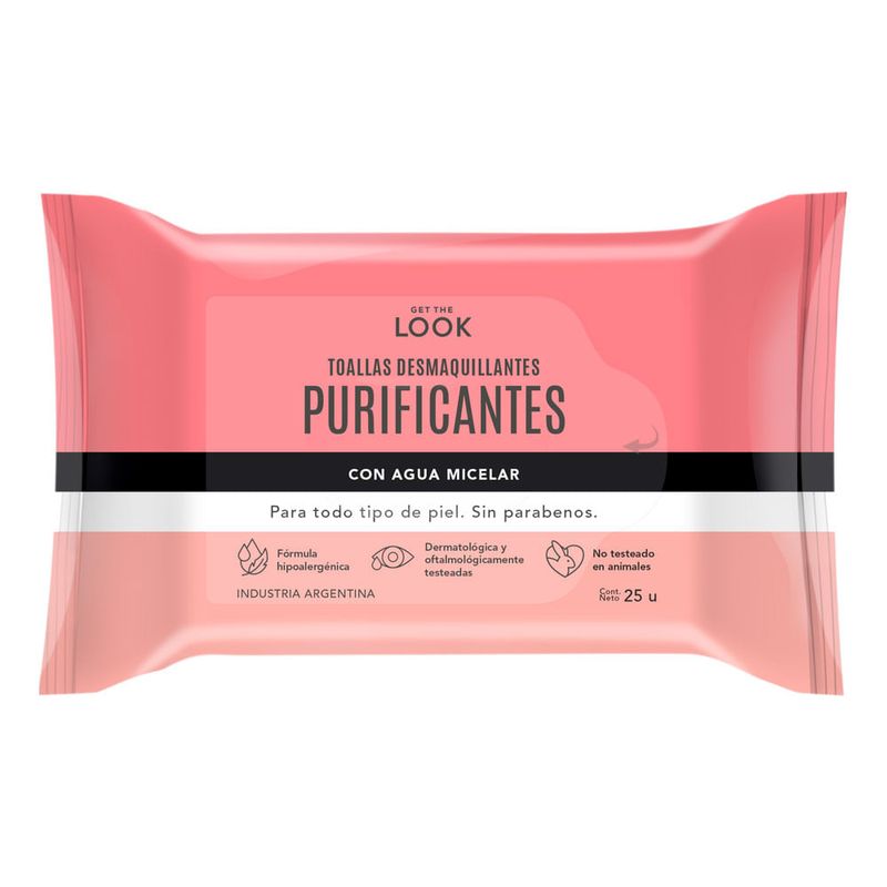 Toallas Desmaquillantes Get The Look Purificantes con Agua Micelar. Para todo tipo de piel sin parabenos. Formula hipoalergénica. Dermatológica y oftalmológicamente testeado. No testeado en animales.